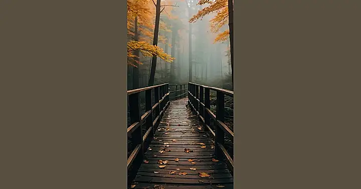 This picture is like a scene from a fairytale, but with a twist! Imagine you’re walking through a magical forest, the trees all around you turning beautiful shades of orange and yellow. The air is thick with fog, making everything look soft and dreamy. You’re walking on a wooden bridge, and it feels like you’re stepping into another world. It’s like something out of a movie, or maybe a video game!