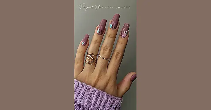 Those sparkly butterfly jewels are the perfect touch. They’re like a little bit of nature’s beauty added to the whole vibe. You can totally tell that someone took a lot of time and effort to get these nails looking so amazing. It’s like art on their fingertips! I bet their friends are jealous, haha.