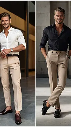 This guy is rocking a seriously stylish outfit that’s perfect for any occasion, from a fancy dinner to a night out with friends. That brown jacket just screams “sophisticated” and his pants are the perfect shade of tan, like a delicious cup of caramel latte. And those shoes? They’re sleek and edgy, but not too over-the-top. This outfit is a winner for sure!