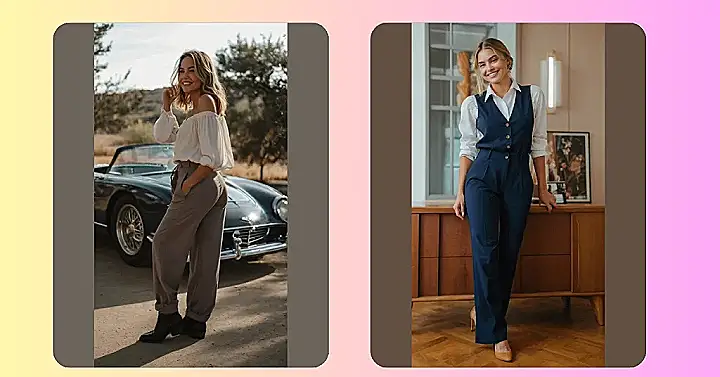 This girl’s got style for days! Just look at those awesome trousers – they’re comfy, they’re stylish, and they make her look like she’s ready to take on anything! Her outfit is like a cool breeze on a hot day – breezy, comfy, and just plain awesome! She’s rocking those trousers with a cute top and some killer boots, and honestly, she’s making us wanna hop in a classic car and go for a road trip too!