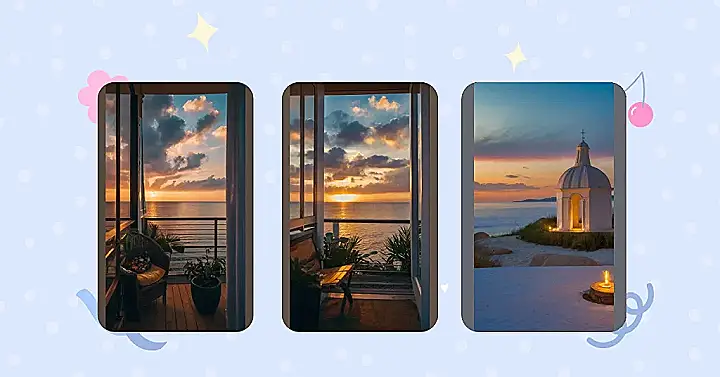This picture is like a postcard from a dream! It shows a tiny white chapel perched on a cliff, looking out at the ocean. The sky is painted in a thousand shades of pink and orange, making it look like someone spilled a giant glass of fruit punch all over the heavens. You can almost hear the gentle waves crashing on the shore and feel the warm breeze carrying the scent of salty air.
