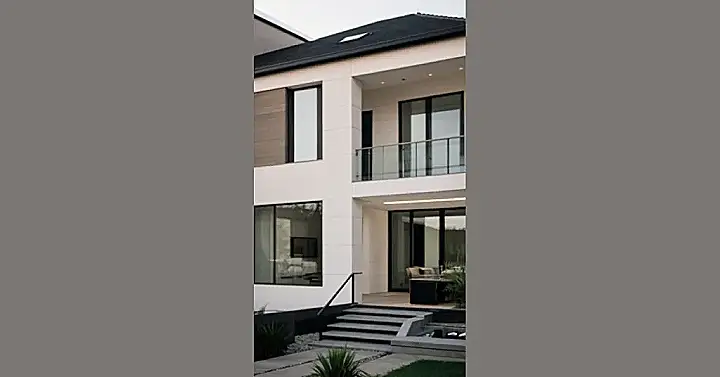This house is like a big, modern puzzle box, with clean lines and simple shapes. It’s all about the cool, calm look – just imagine chilling on the balcony with your friends, enjoying the sunset, and feeling like you’re in a super sleek, minimalist movie! The house is so smooth and stylish, it makes you want to wear your best outfit just to match it!