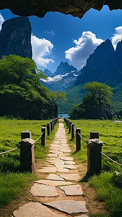This picture is like a portal to another world! Imagine you’re a brave adventurer, stepping out from a hidden cave and onto a magical path. The stone steps lead you deeper into a mystical valley, with towering mountains that seem to touch the clouds. It’s like something out of a fantasy novel, where anything is possible!