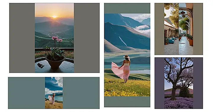 This picture is like a scene straight out of a fairytale! The woman in the flowing dress looks like she’s about to skip off into a magical land, and the view behind her is absolutely breathtaking. It’s like a picture-perfect postcard, all bright colors and lush greenery. You can almost hear the birds singing and the wind whispering through the tall grass.