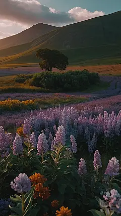 This picture looks like a scene straight out of a fairytale! Imagine walking through these fields of purple flowers, the sun setting over the rolling hills in the distance. It’s like a dreamy, magical world. You could almost hear the wind whispering through the flowers, and the birds singing sweet melodies.