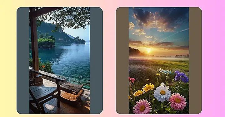This picture makes you want to grab a warm cup of coffee and relax on a sunny morning, right? It’s like a perfect little scene straight out of a postcard. The sun is shining, the sky is a mix of pretty pinks and oranges, and you’ve got a mountain view that’s better than any TV show. There’s even a cute little bouquet of flowers to make the whole thing extra fancy! Who wouldn’t want to wake up to this?