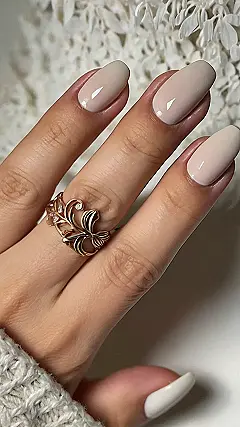 These nails are so chic, they practically scream “nature” with that gorgeous, understated neutral color. Imagine a peaceful forest, dappled sunlight, and the soft whisper of leaves – that’s the vibe this manicure gives off. It’s like a peaceful escape from the hustle and bustle of everyday life, and it’s all thanks to those beautiful, natural nails. But the real star of the show is that ring! It looks like a delicate flower blossoming on the finger, adding a touch of elegance that’s totally unexpected. This ring is like a tiny garden party for your finger – it’s whimsical and charming, and it’s sure to turn heads.