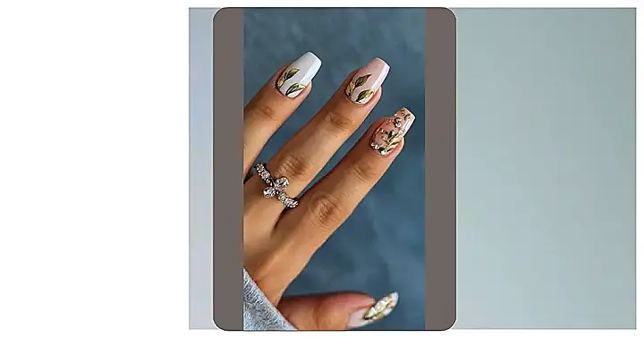 These nails are so pretty, they’re practically begging to be admired! Imagine you’re strolling through a garden, the sun warm on your face. You see delicate wildflowers peeking out from beneath lush green leaves. That’s exactly what these nails look like! The flowers are so realistic, they almost feel like they could brush against your cheek. It’s like a mini-garden right on your fingertips, which is super cool!