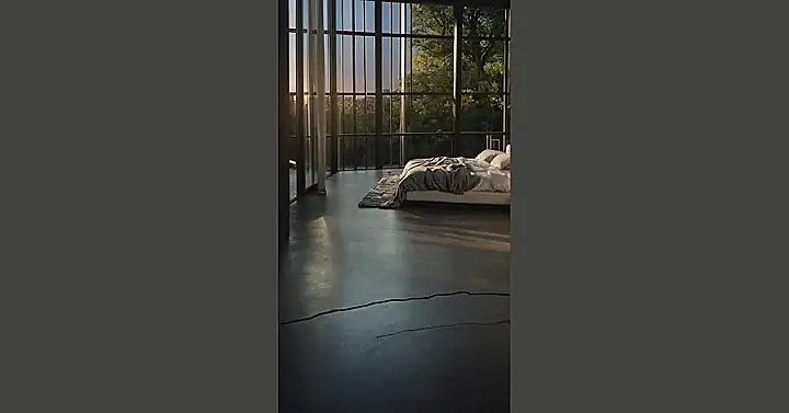 Imagine waking up in this bedroom. It’s like having your own personal forest outside your window! You can see the tops of the trees swaying in the breeze, and you might even hear birds singing their morning songs. The big windows let in tons of sunlight, and the fluffy bed looks super comfy. You’d be tempted to stay in bed all day, but wouldn’t that be a waste of such a beautiful day?