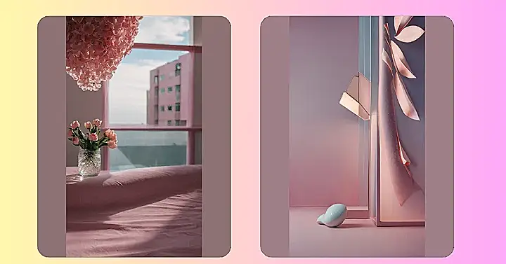 This image is like a scene from a dream – a pink and blue wonderland with mysterious shapes and shadows. It looks like someone’s about to paint the room, but they left a strange little bird egg thing lying around. Maybe it’s part of the design? Or maybe it’s a clue! You know, like a secret code or something.