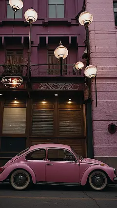 This picture is like a scene straight out of a retro movie! It’s got everything: a classic car, a cool building, and just the right amount of pink to make you smile. This little pink car looks like it just rolled out of a 70s car show, and it’s parked right in front of a building that’s practically begging for a makeover with pink wallpaper. You can just imagine a group of friends driving around town, with the windows down, singing their hearts out to their favorite tunes.