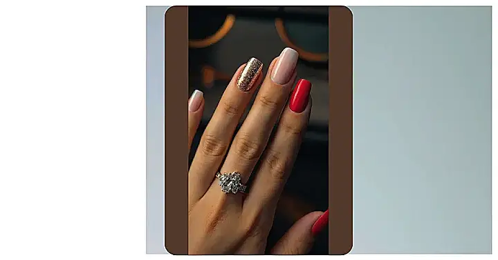 This picture shows off some seriously fabulous nails! The red polish is super shiny and makes the nails look long and elegant. It’s like a firecracker, but on your fingers! But the real star of the show is that gorgeous ring. It’s got a big, sparkly stone, and the diamonds all around make it look even more dazzling. The ring is like a tiny crown for your finger – fit for a queen!