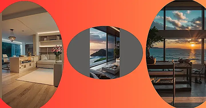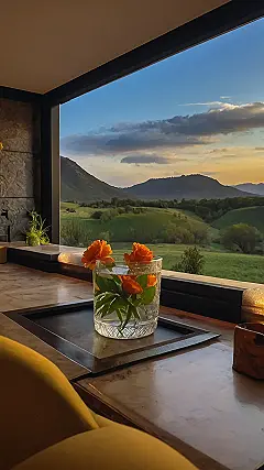 The picture shows a comfy-looking room with a big window. You can see a bunch of hills and a beautiful sunset outside. It looks like the perfect place to relax and enjoy the scenery. Maybe it’s a chill spot in a hotel or someone’s fancy living room! It reminds me of those cozy places where you can just sit and sip tea while watching the world go by.