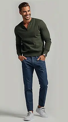 This guy knows what’s up! He’s rocking the classic men’s clothing style that never goes out of fashion. Think comfortable and stylish, like a cozy sweater that makes you feel good, paired with jeans that fit just right. He’s got that “I woke up looking this good” vibe, but without trying too hard. It’s a look that says “I’m confident and put-together,” without shouting it from the rooftops. Basically, he’s the kind of guy you’d want to be friends with, because he’s got that timeless cool factor down pat.