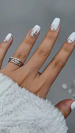 Wow, those white nails are seriously chic! They’re like little canvases for those sparkly gold designs. It’s like someone took a tiny paintbrush and said, “Let’s add some bling!” And the rings? Don’t even get me started! Those diamonds are sparkling so much, they’re practically shouting “Look at me!” You know, I’m thinking maybe I should get some white nails with sparkly details – they’d definitely make my fingers look like they’re holding a mini disco ball!