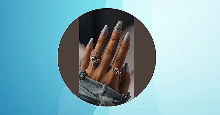 These nails are seriously giving us fall vibes! Just like the leaves changing colors, these nails are transitioning from summer brights to cool-toned beauties. That shimmery glitter is like the first frost on the ground, and the subtle grey polish is like the crisp air of autumn. And don’t even get us started on those rings – they’re like the perfect finishing touch to a cozy fall outfit!