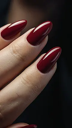 The picture shows some seriously stylish nails. That deep red color is like a warm hug for your fingers. It’s totally the perfect shade for fall, when everything starts turning those beautiful warm colors, like leaves and pumpkins. Imagine walking around with these nails and all your friends being like, “Wow, those nails are so fire!” It’s like a little pop of personality that screams, “Fall is here, and I’m ready to rock it!”
