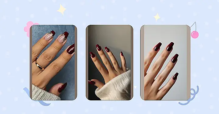 The picture shows some seriously stylish nails. That deep red color is like a warm hug for your fingers. It’s totally the perfect shade for fall, when everything starts turning those beautiful warm colors, like leaves and pumpkins. Imagine walking around with these nails and all your friends being like, “Wow, those nails are so fire!” It’s like a little pop of personality that screams, “Fall is here, and I’m ready to rock it!”