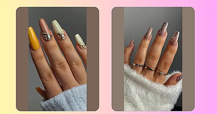 These nails are totally giving us “royal” vibes! Look at those shiny jewels, they’re like tiny crowns for each finger! The gold and yellow colors are perfect for the fall season, and we’re pretty sure even the queen bee herself would be jealous of this look.