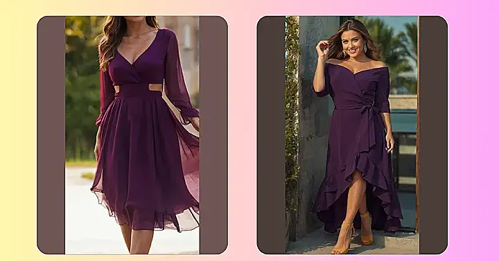 This dress is like a royal purple dream come true. The off-the-shoulder style gives it a touch of elegance, while the flowing, ruffled skirt adds a bit of playful whimsy. It’s like the perfect blend of serious and fun, which is totally what you want when you’re rocking a dress, right? Think of it as the dress that says, “I’m here to have a good time, but I also look fantastic doing it.”