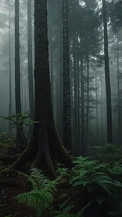 This picture is like stepping into a fairytale! Imagine walking through this misty forest, the air so thick you can barely see your hand in front of your face. The towering trees, all dark and mysterious, seem to whisper secrets only they know. Maybe there are hidden creatures lurking in the shadows, or magical beings who only come out at night. This place is full of possibilities!