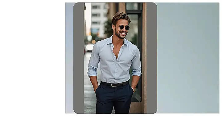 Okay, so you’re thinking about dressing up for a special occasion, like a school dance or maybe even a job interview. You want to look sharp, but you don’t want to look like your grandpa went shopping for you. This guy in the picture has got it figured out! A crisp blue shirt, classic dark pants, and a belt that says “I’m here to impress.” Don’t forget the sunglasses! They’re like the cherry on top of your style sundae.