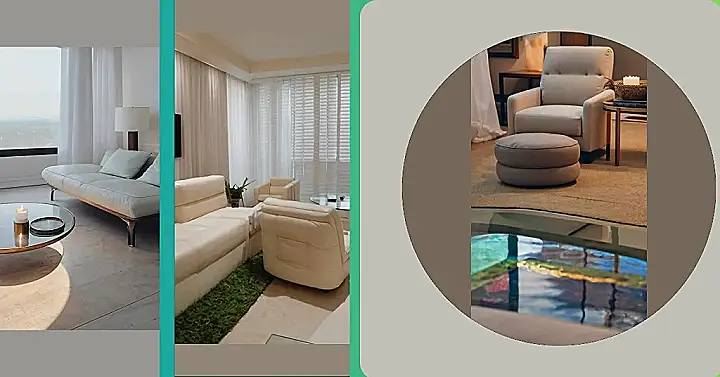 This living room is definitely comfy, with a plush armchair perfect for sinking into with a good book. It’s got all the cozy vibes – a fluffy rug, a warm candle, and a cool, modern ottoman. But, what’s with that giant mirror on the floor? It’s like they’re trying to make you feel like you’re floating in the middle of a giant, colorful puddle! I wouldn’t be surprised if the next thing you see is a fish swimming by.