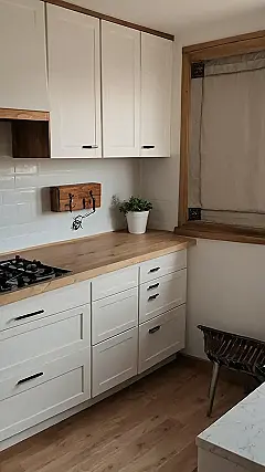 This kitchen is proof that you don’t need a million things to make a space feel cozy and inviting. The simple white cabinets and wooden accents give it a clean, modern look, and the wooden countertop is perfect for whipping up delicious meals. It’s like a blank canvas just waiting for you to add your own personality! Plus, can we talk about that cute little plant? It adds a touch of life and personality to the whole space. It’s like saying, “Hey, this is my home, and it’s all about simple things done well.”