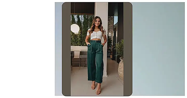 This girl is rocking a seriously stylish look! She’s got on these amazing green pants that look like they’re straight out of a fashion magazine. They’re kind of wide-legged, which makes them look super comfy and cool. And the way they’re cuffed at the bottom? It’s like she’s saying, “I’m ready to strut my stuff!” Plus, she’s got a cute white crop top that makes her waist look tiny. It’s the perfect outfit for hanging out with friends or maybe even going to a fancy dinner. You know, the kind of outfit that makes you feel confident and ready to take on the world!