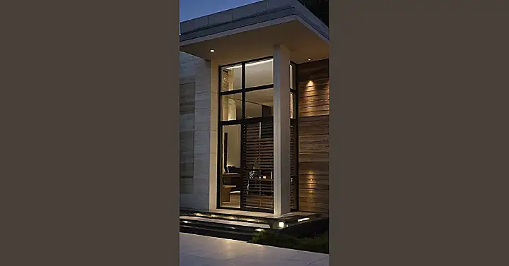 This house looks like something straight out of a sci-fi movie! It’s got a sleek, modern design with a huge window that looks like it’s made of a million tiny squares. It’s like looking into a futuristic world! The outside is all stone and sharp lines, which makes the big window stand out even more. You can practically picture yourself walking through that doorway into a super cool, minimalist house with all the latest gadgets.