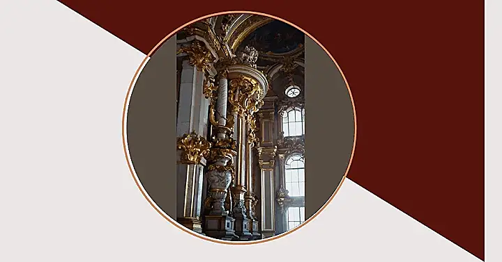 This picture looks like a room straight out of a fairytale! It’s got all the fancy stuff you’d expect in a palace, like super fancy columns and a ceiling that’s so detailed you could get lost in it. It’s also a prime example of Baroque architecture. Remember, “Baroque” means super fancy and over the top, with tons of detail. It’s like someone took a regular building and said, “Hold my beer!” and went wild with the decorations.