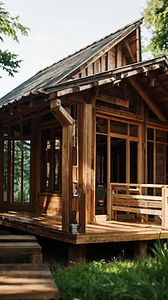 This house is like something out of a fairytale! It’s all made of wood, from the walls to the roof, and it looks like it’s straight out of a storybook. You can almost imagine a family sitting on the porch, sipping hot chocolate and watching the sunset.