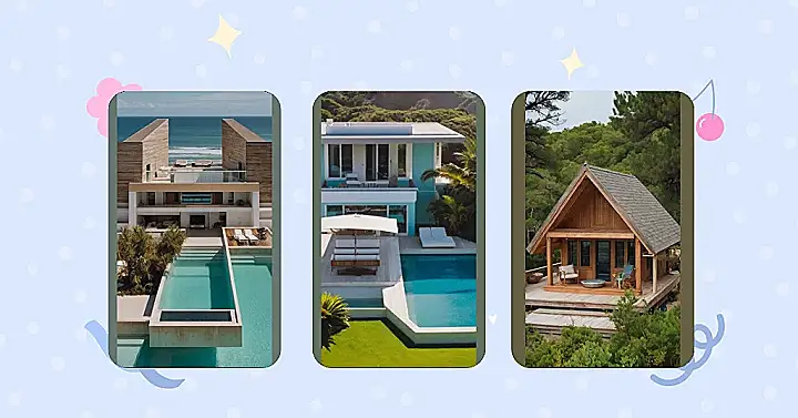 This picture is like a postcard from paradise! You’ve got a gorgeous white beach house nestled right on the shore. The house has a swimming pool that looks like a giant blue gemstone, and the palm trees swaying in the breeze just add to the relaxing vibe. You can almost imagine yourself lounging on the beach, building sandcastles, or sipping lemonade while listening to the waves crashing on the shore.