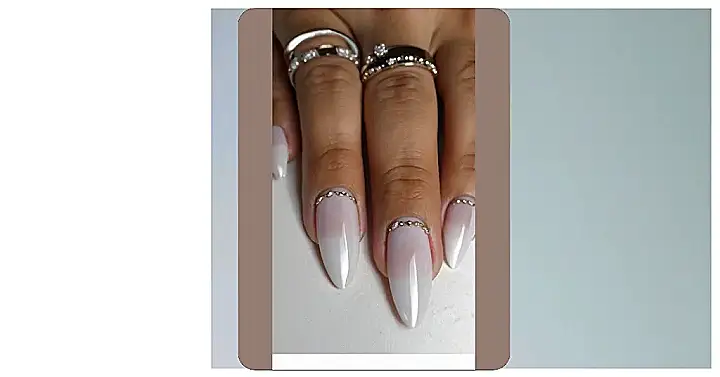 These nails are like a fancy dress-up for your fingers! They’re white, so clean and fresh, and they’ve got these super cute little sparkly accents around the tips. It’s like they’re whispering “I’m ready for anything!” Plus, those nails are long and pointy, making them look totally chic. I bet everyone will be asking you where you got your nails done after they see these beauties!