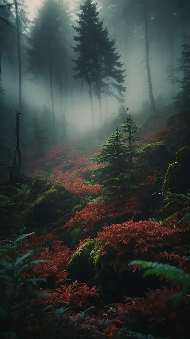 This picture looks like a forest that’s been hiding in the shadows for years! The tall, mossy trees create a tunnel of green, and the fog hanging in the air makes it feel like you’ve stumbled into a magical storybook. You can almost hear the whispers of ancient trees and imagine little creatures peeking out from behind the ferns. It’s like a place where the forest goes to sleep, and dreams of all the amazing things that happen under its leafy canopy.