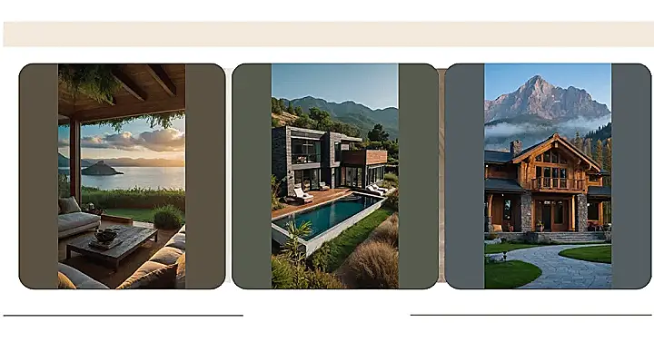 This house is like something out of a fairytale! It sits nestled among rolling green hills, with majestic mountains rising up in the background. The warm glow of the sunset paints the sky with beautiful pink and orange hues, making it look like a scene straight from a storybook. Imagine sipping hot cocoa on the porch as the sun sets, watching the stars twinkle above. This home definitely has the “dream nature home” vibes!