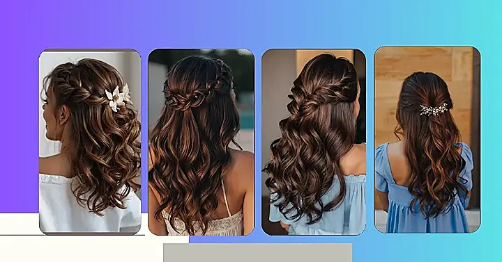 The picture shows a girl with curly hair that’s been styled to perfection! She’s got a cute little braid that looks like it was made just for her, and it’s held in place with a couple of flowers. It’s like she’s ready for a fancy party or a special day, and it makes you want to ask, “Where are you going?” It’s definitely a hairstyle that would turn heads and make you feel like a princess!
