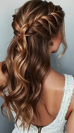 This hairstyle is like a mix of two worlds, a little bit of braided princess and a whole lot of beachy vibes! It’s totally perfect for someone who wants to look both polished and relaxed, like you’re ready for a fancy party but also just chilling by the pool. Imagine those waves catching the sunlight – it’s like a spotlight on your hair!
