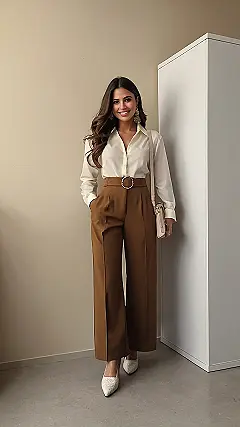 This outfit is like a total boss move – a creamy white shirt that’s so comfy, you could probably sleep in it (don’t, though!), paired with seriously chic brown trousers. It’s the perfect blend of professional and put-together, without being stuffy or boring. Imagine walking into your first job interview or acing that big presentation – this outfit will give you all the confidence you need! Plus, those shoes are adorable. They’re the kind of shoes that say, “I’m stylish, but I also know how to power walk to the next meeting.”