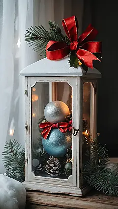 This picture shows how even the smallest apartment can explode with festive fun! That adorable little lantern is packed with Christmas spirit – a sparkly snowman made of ornaments, a cute red bow, pine cones that look like they just hopped off a Christmas tree, and twinkling fairy lights. It’s proof that you don’t need a mansion to create a magical holiday atmosphere; sometimes, the most charming decorations are the simplest and most creative.