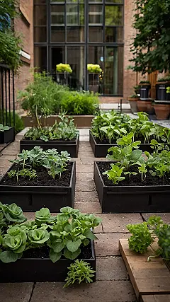 Imagine turning that boring brick patio into your own personal salad bar! This pic shows how easy it is to do some urban gardening. Forget trekking to the grocery store; you could be picking fresh lettuce and herbs just steps from your back door. Who needs a massive farm when you can have a collection of awesome growing boxes? It is literally like your own tiny, edible kingdom is growing right there.