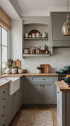 Walking into this kitchen, you’d half expect a golden retriever to greet you with a wagging tail and a freshly baked cookie. It’s got that ‘come on in and stay a while’ vibe, with its super chill grey cabinets and warm wooden countertops that probably smell like freshly cut trees (or maybe just good coffee, which is close enough!). This isn’t one of those super fancy kitchens where you’re afraid to touch anything; it’s all about simple kitchen decor that makes you feel cozy, even if your main contribution to cooking is usually just ordering pizza. Those open shelves look so neat with all the white dishes, you almost forget that somewhere, a sock is definitely missing its pair.