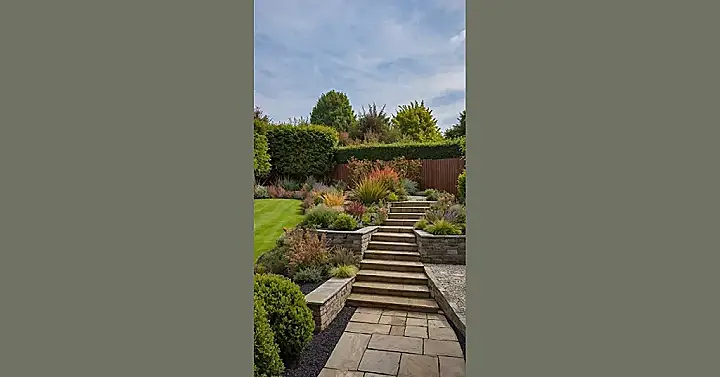 This isn’t your average “mow the lawn and call it a day” kind of front garden! Look at those impressive stone steps, probably built for a dramatic entrance or maybe just to make carrying groceries feel like an epic climb. It’s like the plants themselves are having a massive fashion show, all lined up in their best greens, fiery reds, and sunny yellows, practically posing for a picture. Who needs a simple path when you can have a grand landscape that totally outshines your neighbor’s flamingo lawn ornaments?