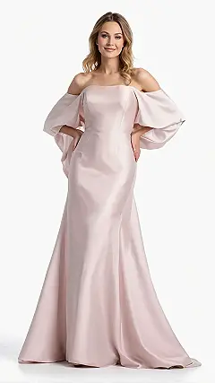 Looking at this incredible gown, you might just feel like you’ve stepped right out of a fairy tale, or maybe even a really fancy awards show. That delicate pink color and those fabulous off-the-shoulder sleeves aren’t just pretty; they’re practically screaming, “Hello, elegance, where have you been all my life?!” This is the kind of dress that makes you want to practice your red carpet pose in the mirror, complete with an imaginary crowd cheering. Just try not to get *too* carried away and forget your actual name when someone asks – the gown might just hypnotize you into feeling like royalty!