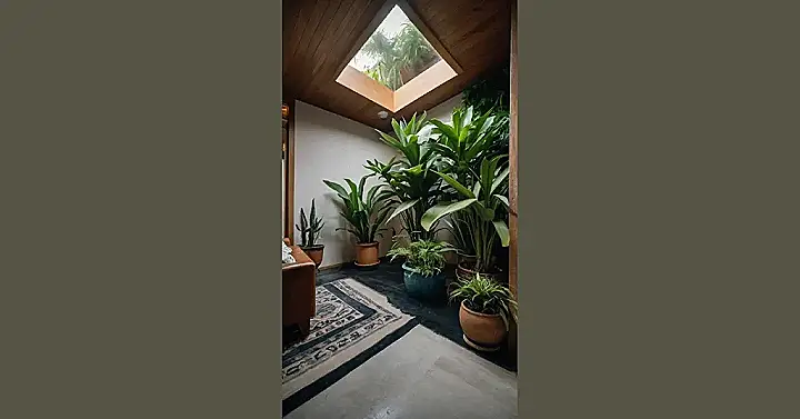 This room is like a jungle, but without the bugs and humidity! It’s all thanks to a skylight that lets in the sunshine, and the plants are loving it. They’re like little green friends who are happy to soak up the rays and keep the air fresh. Maybe you could even hang out with your buddies in this space and pretend you’re on a tropical vacation, just be sure to bring some sunscreen for your imaginary adventure.