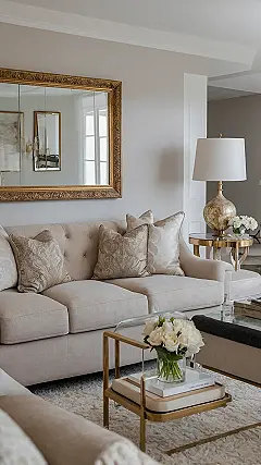 Walking into this living room feels like you just won the lottery for ‘Most Elegant Nap Spot.’ Check out that massive gold-framed mirror – it’s so grand, it probably reflects a slightly more sophisticated version of you, even when you’re just wearing sweatpants. And the sofa! It’s so perfectly plump and light-colored, you’d swear it silently judges your snack choices. One crumb out of place and you just know it’s going to give you the side-eye, but like, a really classy side-eye.