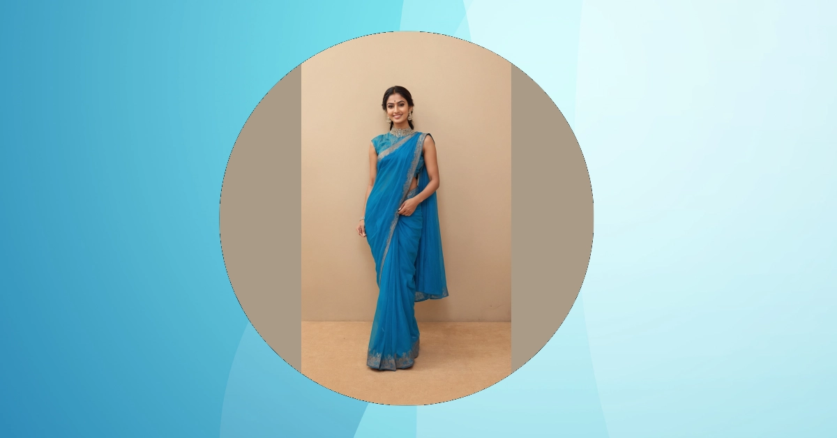 Who knew looking this effortlessly chic could be so fun? The gentle waves of the blue saree complement that stunning blouse perfectly, creating a vibe that’s both fancy and relaxed. She’s giving us “I woke up like this” energy, even though we all know mastering a saree drape is basically an Olympic sport! But honestly, the way that blouse shines, it’s totally worth any extra pleats or pins. It makes the whole look feel fresh, friendly, and totally ready for compliments, proving that a fantastic saree blouse can turn a great outfit into an unforgettable one.