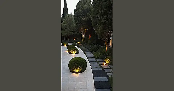 Look at the main patio area, all those big, smooth rock tiles stretching out like a super-cool, easy-to-clean dance floor. They’re like the VIP section of your yard, just waiting for you to hang out on them. And those perfectly round bushes lit up? They’re like little green spotlights, maybe showing off how awesome these big rock tiles are. It’s kind of funny how these solid, silent rocks just sit there looking cool, making everything else around them, like those fancy bushes, look even better. They’re basically the chill background singers making your garden look like a superstar.