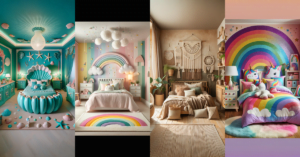 The coffee table is the star of the show! It’s all black and sleek, with gold accents that are just subtle enough to say “I’m high-end, but not trying too hard”. It’s like the cool, older sibling who knows how to have fun but still keeps it classy. And the fluffy rug is the super soft, comfy best friend that makes everyone want to hang out. This room is the ultimate chill space, perfect for reading a book, listening to music, or just staring out the window and dreaming of what’s next.