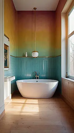 And let’s not forget the main event: that super sleek, freestanding tub just begging for a bubble bath! It’s nestled perfectly amongst all that vibrant glory, practically promising to wash away any Monday blues faster than you can say ‘rubber ducky.’ With natural light pouring in from that giant window and a cool gold pendant lamp looking like it’s ready to drop a disco ball, this isn’t just a place to get clean. It’s a full-on chill-out zone where you can soak up good vibes, surrounded by decor that’s basically a cheerleader for your brain, pumping out those happy feelings like it’s going out of style. Get ready to feel totally refreshed and totally awesome!